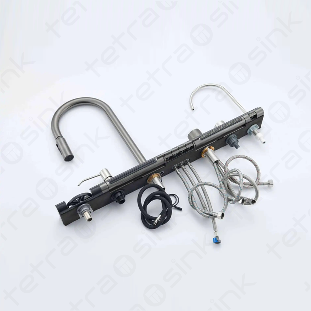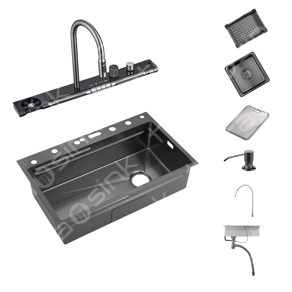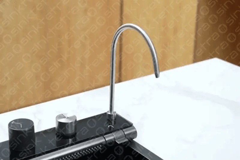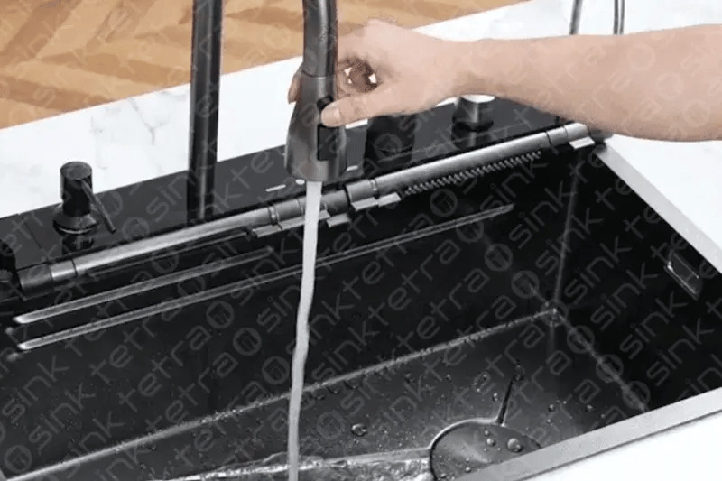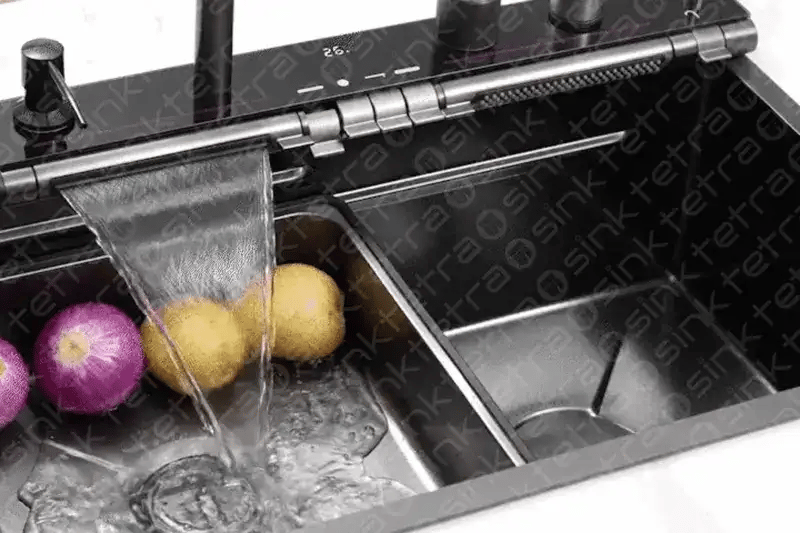Tetra Sink is an innovative and stylish multifunctional kitchen sink, representing the contemporary fusion of aesthetics and functionality. This kitchen sink captures attention not only with its built-in waterfall, providing a sense of luxury to the kitchen, but also with its accessories, making it a true multifunctional device.