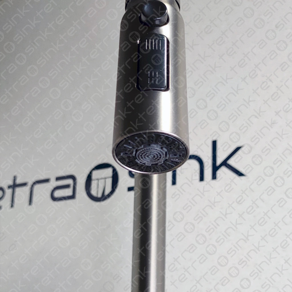 The versatile pull-out faucet offers three water flow options—an aerated stream, sweeping flow, and powerful boost—easily switchable at the press of a button. This design enhances functionality and efficiency, adapting seamlessly to various kitchen tasks.