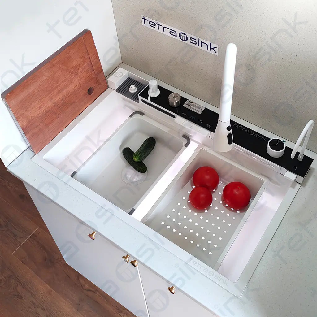 A Tetra Sink multifunctional kitchen sink is the best solution for a modern kitchen. Enjoy a kitchen sink with luxury, a nano sink with an innovative design, a multi-functional kitchen sink, a sink with a waterfall mixer and many kitchen accessories: a draining basket, a cutting board, an automatic cup washer and more.