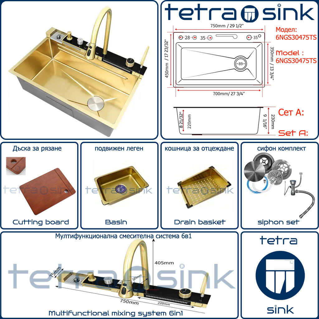 Tetra Sink Multifunctional gold kitchen sink with Nano 3D Platinum Coating Digital Temperature Display & LED Lighting - 6NGS30475TS